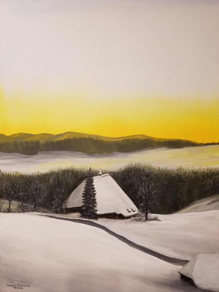 Winterabend im "Unteren Gschweng" Öl auf Leinwand 50x75cm. Der untere Gschwenghof ist einer der ältesten erhaltenen Schwarzwaldhäuser im Heidenhaus-Stil rund um Gütenbach. Im Privatbesitz